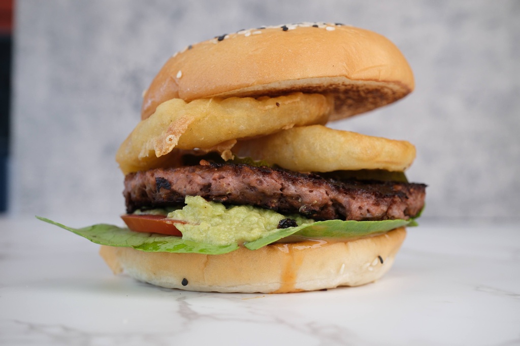 Plant based Beyond Meat patty, lettuce, tomato, pickles, crunchy onion rings, avocado, and On It Sauce